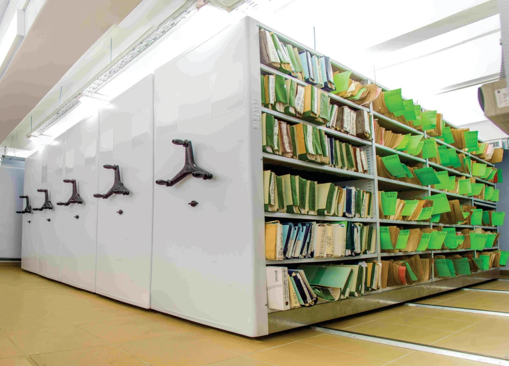 Архивные системы на рельсах обеспечивают компактное и эффективное хранение документов, позволяя значительно экономить пространство.
